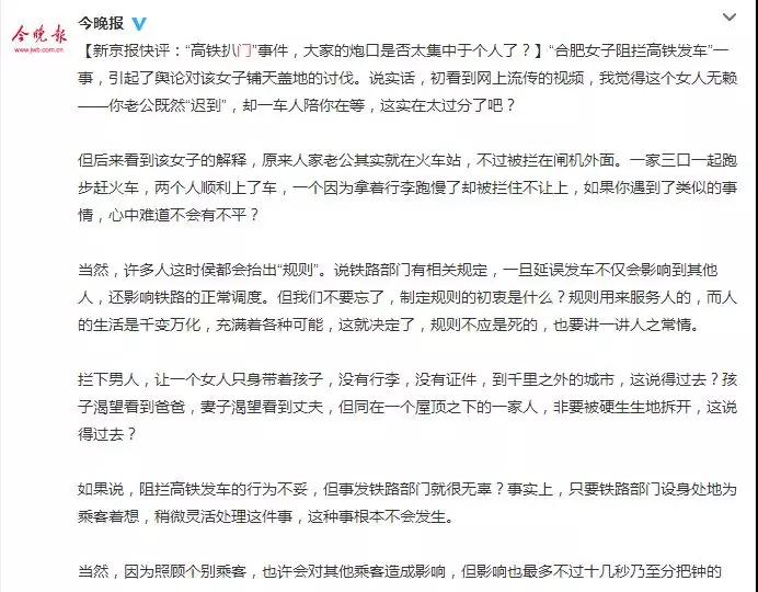 在這個事件中,輿論的風向都在批判、斥責該女子行為,但也有為這名女子發聲的,如新京報快評:《“高鐵扒門”事件,大家的炮口是否太集中于個人了?》一文就為該女子打抱不平,稱制定規則的初衷是為服務人們,但不能漠視少數人的權利。其實作為公民,我們應該維護公共安全,遵守相關法律法規,文明、安全出行。正所謂無規矩不成方圓,有法律方定乾坤。但除此之外,我們也應該根據實際情況權衡事情的利弊,既要保證大多數人的利益,也不要忽視那些少數人的利益。