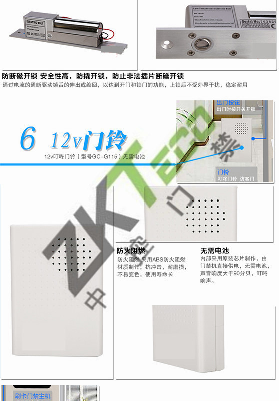 安裝和使用異常簡單,連線、電鎖控制等和IC/ID卡門禁系統一樣,具備指紋液晶提示每一步操作,您基本不需要說明書都可以進行設置和管理。拋棄了一般指紋設備復雜的操作,而且F7指紋門禁的操作和使用都不需要依賴于電腦,可以獨立設置和運行。