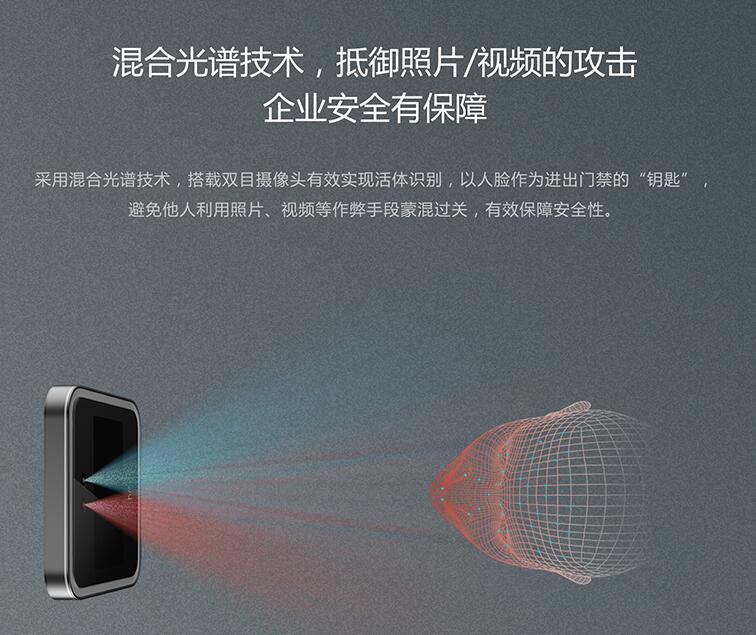 配置: 魔點D2搭載1.45GHz處理器、1GB內存、8GB存儲;支持藍牙和有線網連接,還內置了補光燈,在昏暗的條件下都能夠精準識別人臉。 安全:魔點D2可以達到99.99%的支付級別精準度,即使角度不同、佩戴眼鏡或是化妝,都不會影響識別的精度。它同時還具備混合光譜的技術,可以實現活體識別,照片或者是視頻等等都騙不過它