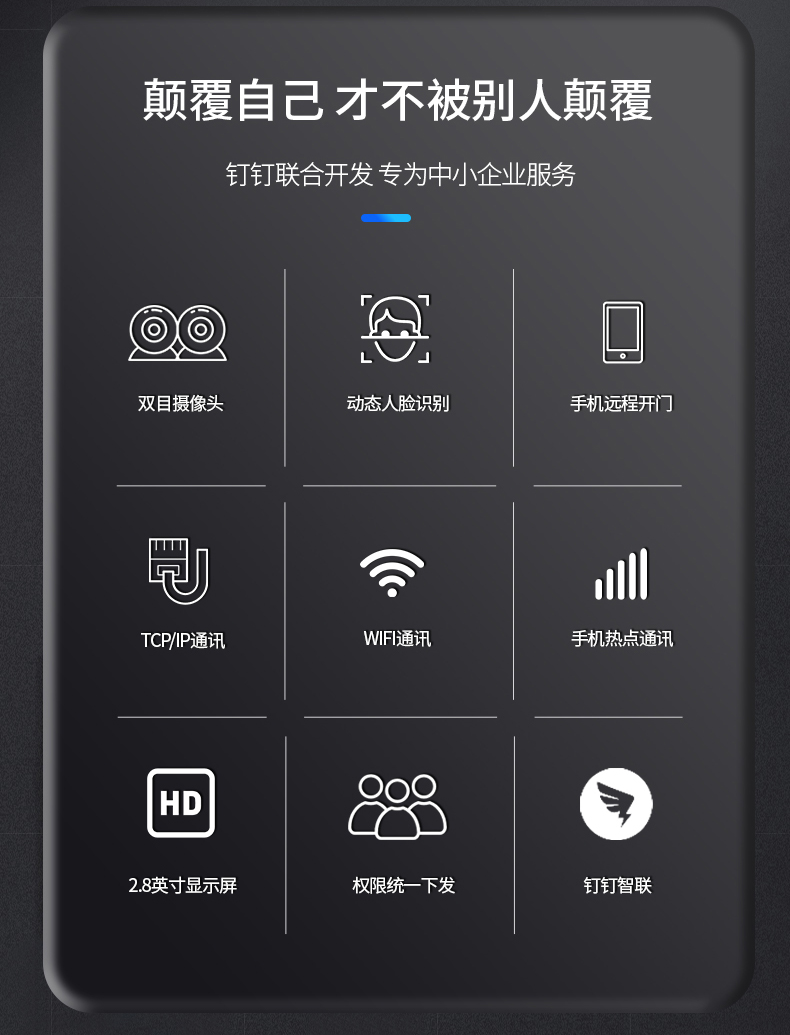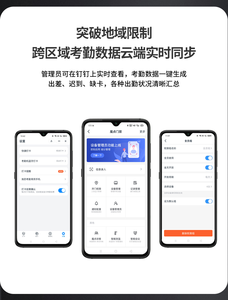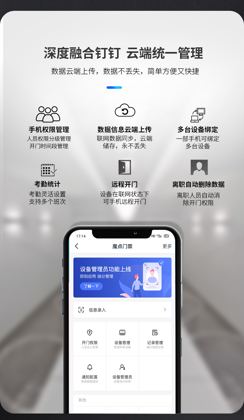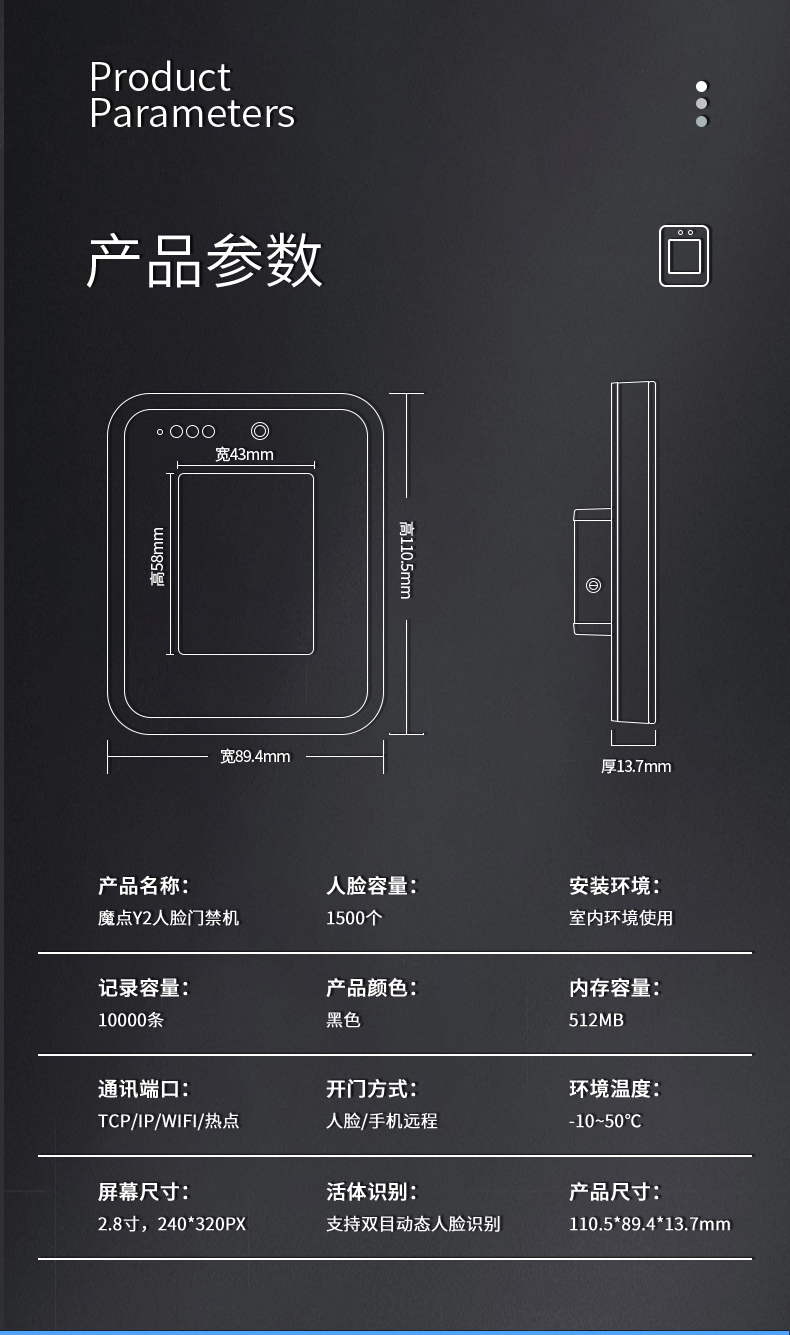 魔點Y2智能人臉考勤門禁搭載海思處理器和智能雙攝,配2.8寸觸摸屏,識別速度僅0.3秒,離線支持1500張人臉容量。 雙目合璧 活體防偽 采用混合光譜技術(shù),活體防偽,抵御圖像攻擊 突破地域限制 跨區(qū)域考勤數(shù)據(jù)云端實時同步 考勤數(shù)據(jù)一鍵生成,手機可查,輕松便捷 出差,遲到、缺卡,各種出勤狀況清晰匯總 擺脫空間束縛 支持多場景安裝 玲瓏身材,支持玻璃、大理石、乳膠漆等多種墻面安裝,適配更多樣,使用更便捷